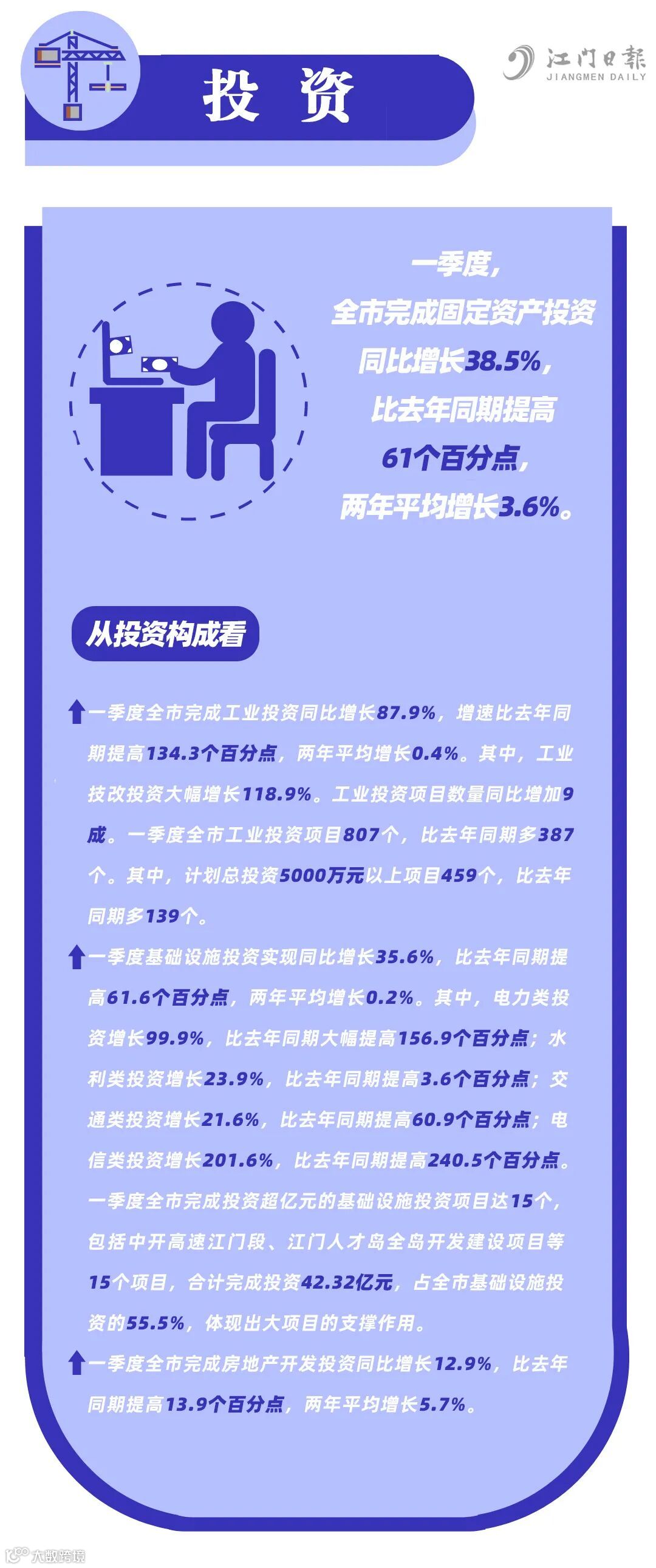 一季度,全市完成固定资产投资同比增长38.5%,比去年同期提高61个百分点,两年平均增长3.6%。