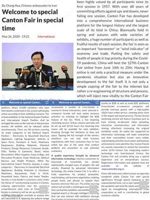 2020年5月26日,驻伊朗大使常华在《德黑兰时报》发表署名文章,题目是《欢迎参加特殊时期特别的广交会》。