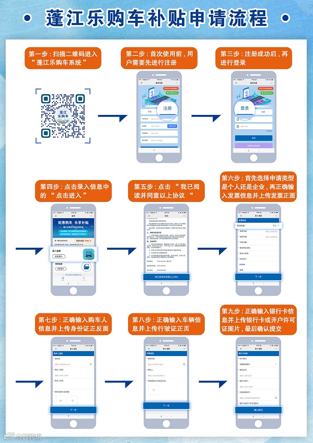 (一)关注“蓬江政府网”公众号,点击“政府服务”,再点击“蓬江乐购车”申请,又或者扫描下图二维码: