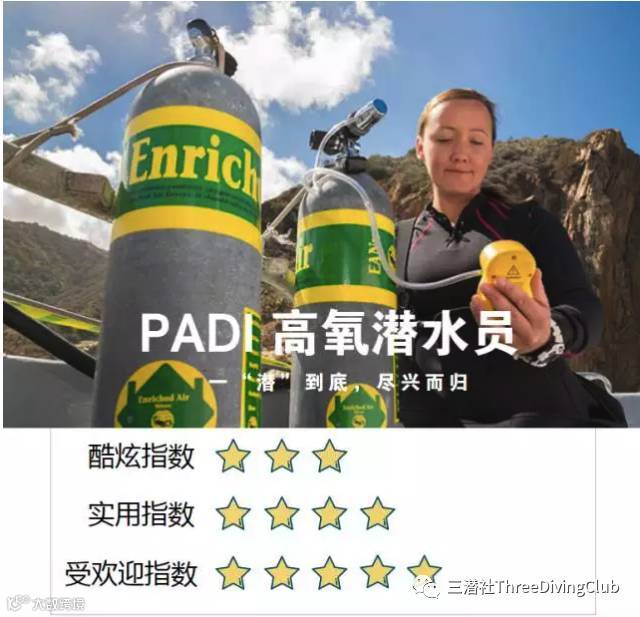 PADI 最受欢迎的专长课程之一,学了 PADI 高氧专长潜水课程后,你就可以使用高氧空气Nitrox(氧气含量在22%-40%之间,最常用的是32%或者36%的高氧气瓶)进行潜水了。高氧气瓶,顾名思义,它的含氧量高于普通气瓶。背着高氧气瓶下水,可以增加你的免减压时长,可以减短你在水面的休息时间,很多潜水员在船宿前都会选择学习一个高氧专长。