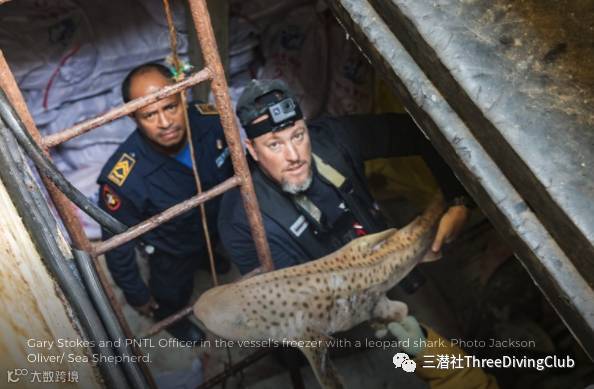 (Gary Stokes与东帝汶国家警察官员在船上的冰柜里查获的豹鲨 图片/Jackson Frauenfelder / Sea Shepherd)
