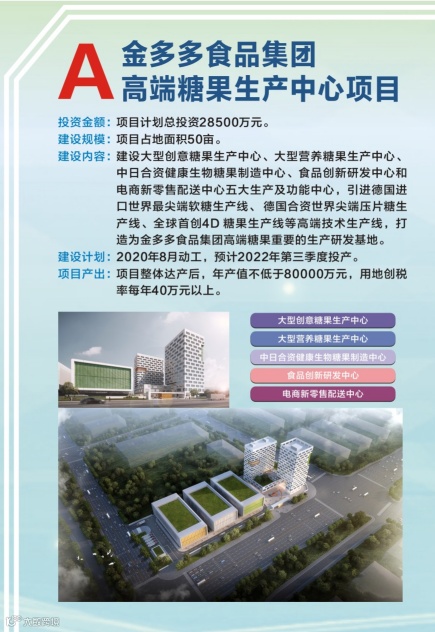 本次集中动工(投产)项目涵盖产业、城建、交通基础设施、民生等多领域。其中投资近3亿元的金多多项目在区发展和改革局、服务企业专责小组的提前介入、反复协调及“保姆式”服务下,运用“容缺审批”“投资承诺制”,从8月27日土地摘牌到8月28日动工仅用24小时,刷新全市记录,再现“高新速度”。该项目将建设大型创意糖果生产中心等五大生产及功能中心,引进世界最尖端软糖生产线,打造高端糖果生产研发基地。