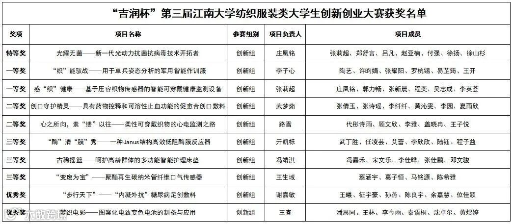 吉润国际为进一步点燃纺织服装类大学生的创新创业热情,于2024年9月-10月在江南大学纺织科学与工程学院举办“吉润杯”第三届江南大学纺织服装类大学生创新创业大赛。大赛启动后,经过立项培育、项目申报、专家初审,共计12件参赛作品入围决赛。
