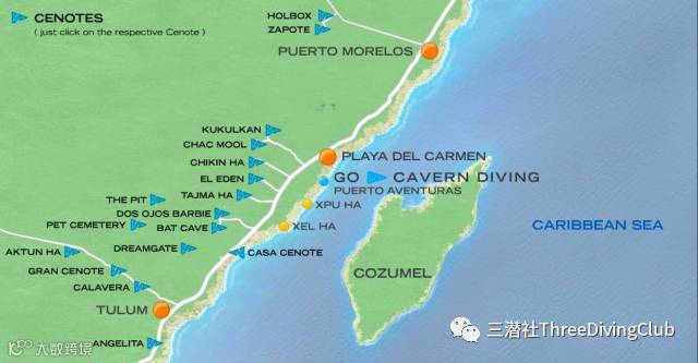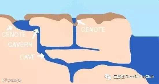 墨西哥-尤卡坦半岛有世界上已探明的最长最复杂的水下洞穴系统,这里本被多孔石灰岩的地质结构覆盖,经历数百万年的地质演变,部分洞穴的顶部逐渐下陷,形成了cenote(习惯称天然井或天坑,古玛雅人也将其称为“通往地狱之门”)。