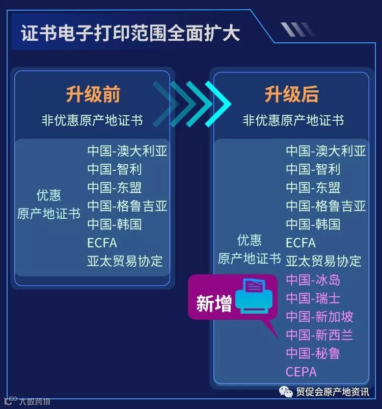 贸促会中国-冰岛、中国-瑞士、中国-新加坡、中国-新西兰、中国-秘鲁自贸协定及内地与港澳关于建立更紧密经贸关系的安排(CEPA)项下原产地证书,原有印制格式针式打印机打印升级为电子格式彩色激光打印机打印。