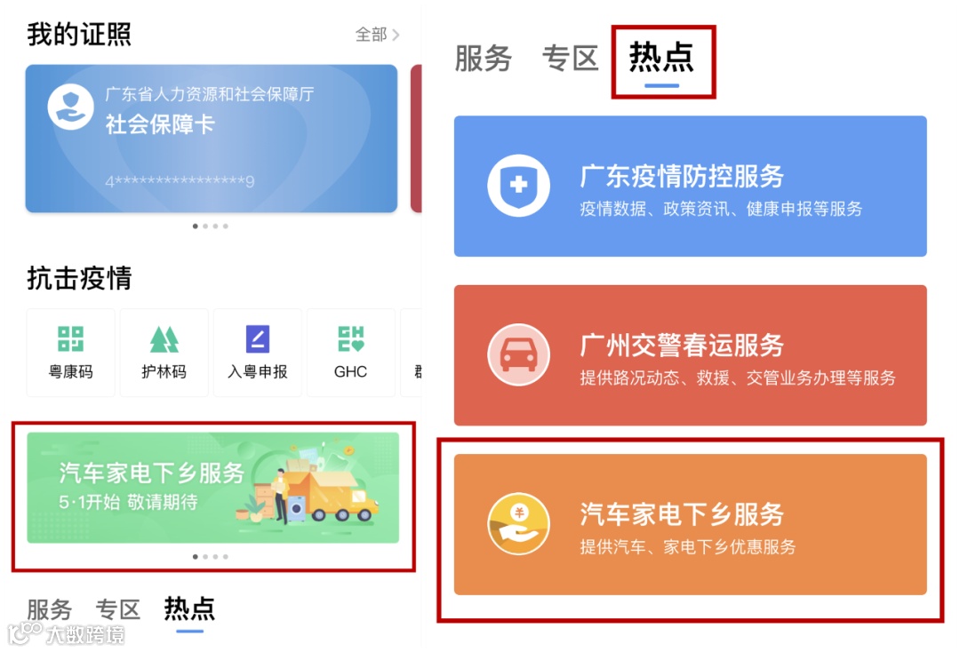 农村居民通过手机微信登录“粤省事”小程序,进入“汽车下乡”栏目查询是否属于补贴对象范围。属于补贴对象的农村居民购买汽车下乡推广车型后,通过经销商在“汽车下乡”登记审核系统进行补贴申请预登记。