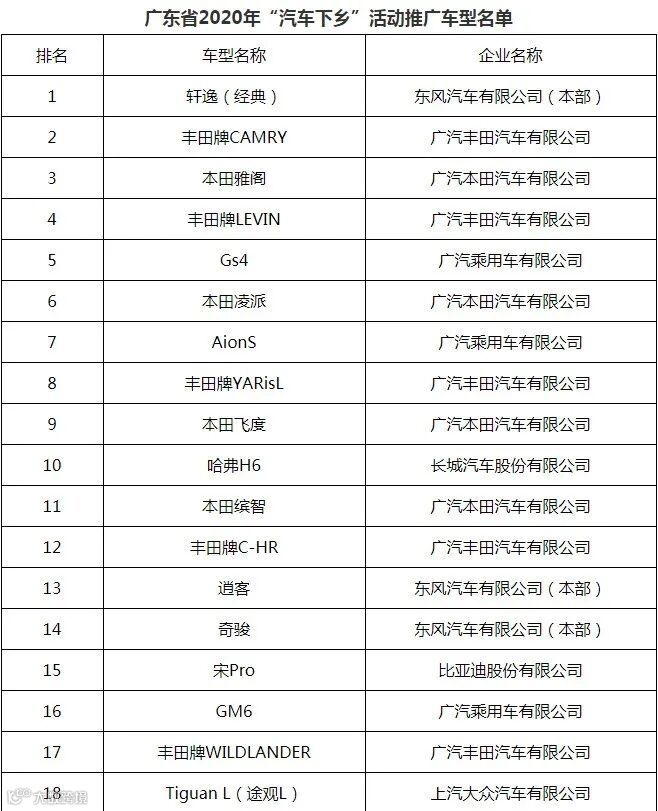 广东省汽车流通协会推荐了60个2020年广东省“汽车下乡”活动推广车型。具体名单如下: