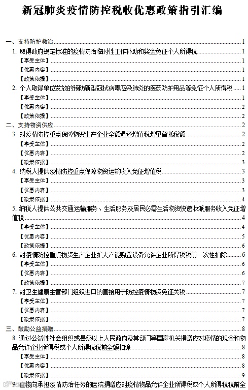 为更好发挥税收支持疫情防控的职能作用,帮助纳税人准确掌握和及时适用各项税收政策,税务总局对新出台的支持疫情防控税收优惠政策进行了梳理,形成了本指引,共涉及支持防护救治、支持物资供应、鼓励公益捐赠、支持复工复产四个方面12项政策。