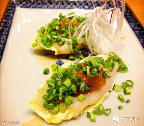 薄如蝉翼的河鲀生鱼片,因造型过于美丽,被小新误以为是盘底的花纹。这个美丽的误会也暗示了河鲀刺身摆盘上的艺术特性——主要分为鶴盛、菊盛、孔雀盛、牡丹盛,皆赏心悦目。不得不说,河鲀料理不仅是舌尖上的云天,还是视觉上的享受。