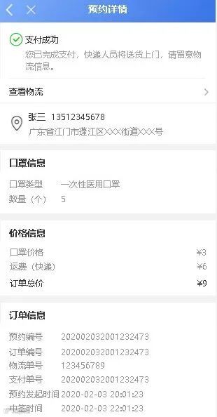 10.成功预定口罩的用户,点击“我的预约”,可查看预约详情及物流动向。