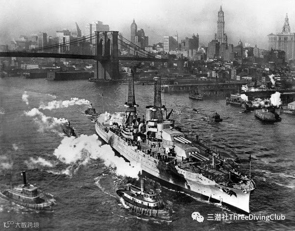 拍摄于1916年,美国亚利桑那号航空母舰在穿过纽约东河前往纽约海军造船厂的途中。