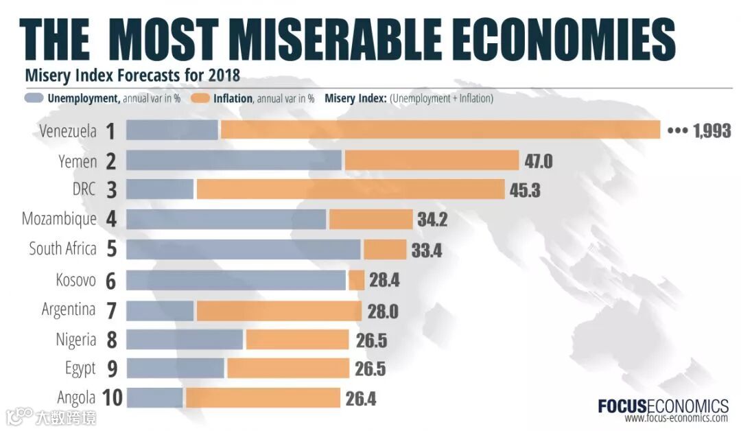 “痛苦指数”主要通过通货膨胀率和失业率等指标计算。面对委内瑞拉奔1000000%的通货膨胀率,也确难有国家能够“望其项背”。
