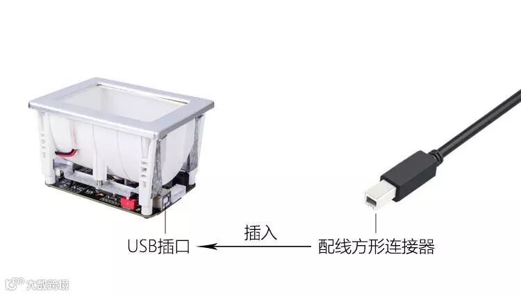 如果您没有看到输出信息或者还有其他需求,您需要根据自己的情况进行配置。取出产品配置用线,将USB 接口配线方形的一端插入扫码器底部的USB接口,如图