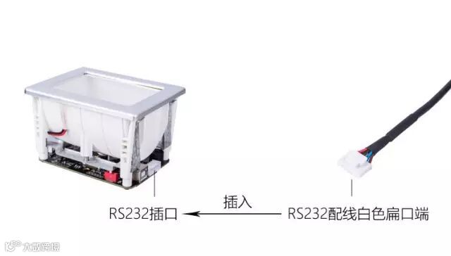 将RS232产品标准配线的白色扁口端与扫码器RS232插口连接,将线缆的USB端与电脑USB口连接
