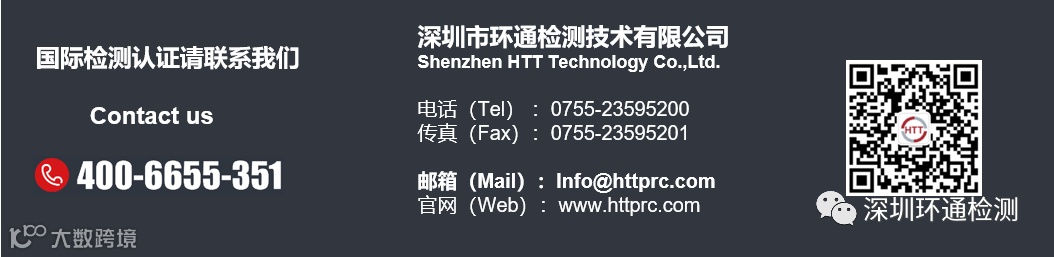 深圳市环通检测技术有限公司(HTT)是具有多年产品测试与认证经验的专业检测认证机构,是国内较早从事进出口商品检测、技术咨询、产品认证的第三方专业检测实验室。公司严格按ISO/IEC 17025的要求建立,实验室目前已获得中国合格评定国家认可委员会CNAS资质(授权号L9969),广东省检验检测机构资质认定CMA(证书号202019014817)及中国海关总署授权的进出口商品检验鉴定机构资格证书(许可号:署检许字881号)。