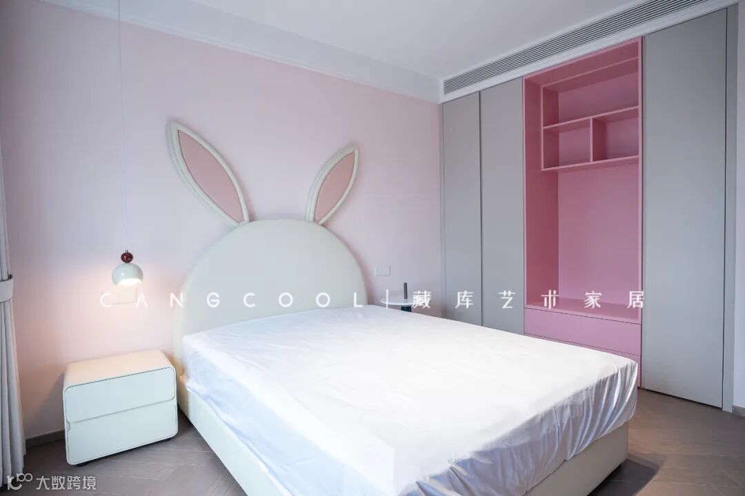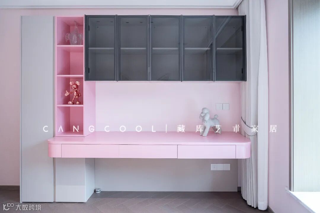 每一个女孩子,内心都有一个粉色的芭比娃娃。所以在色彩搭配上以粉色作为整体环境色,在孩子的成长过程中,一定要给一个非常舒服的床。所以根据窗户的结构,一侧做了组书架,悬浮拉通的书桌,面对窗户视野更加开阔。外开式抽屉,日常方便使用同时,也完美的达到免拉手的目的。整体定制的床头柜,视觉更加简单高级。