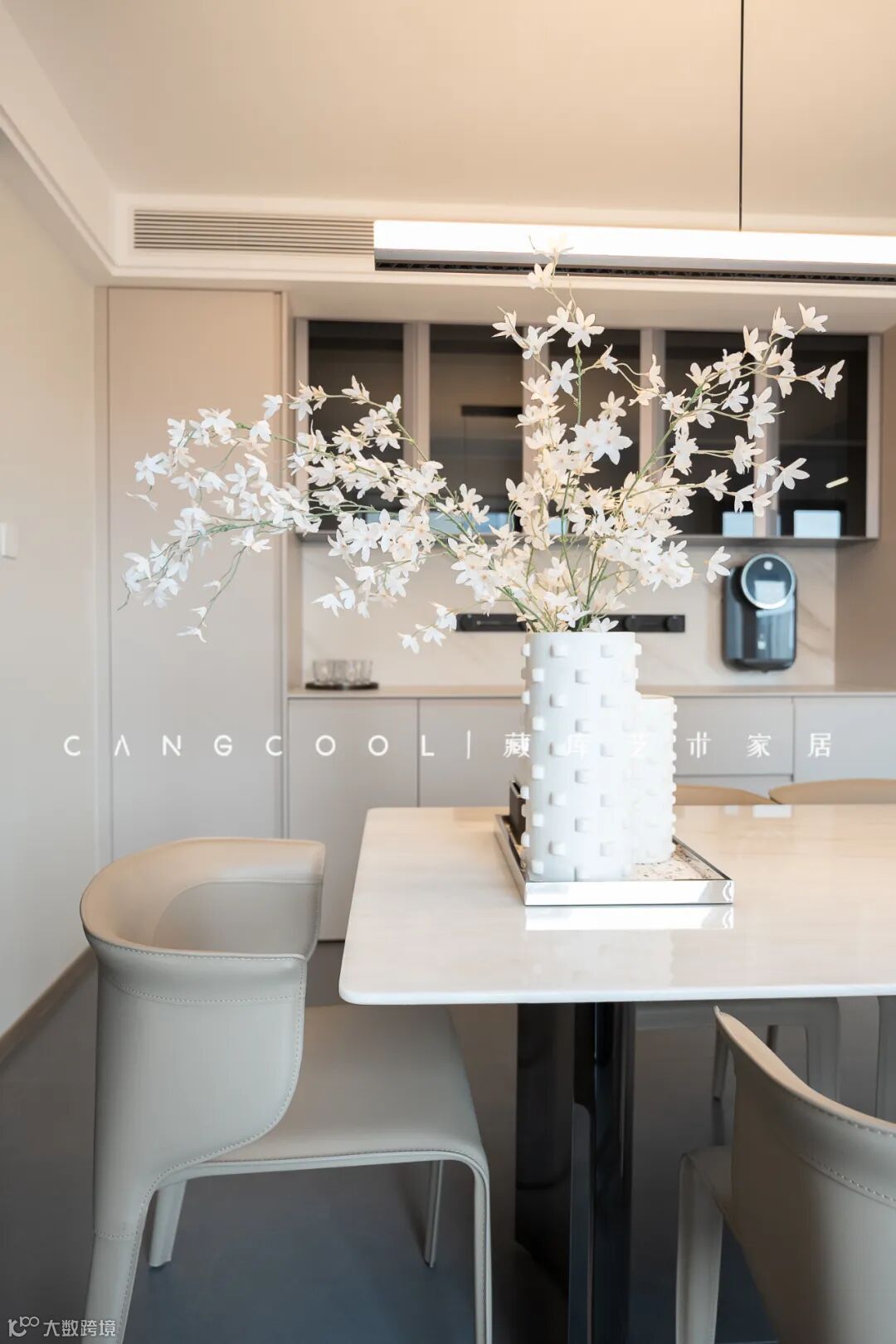 白色餐台与米色系座椅交相辉映,餐厅的开放式设计充满现代时尚感觉。阳光深入空间,大理石优雅奢华,花材带来清新感觉,共同打造仪式感。