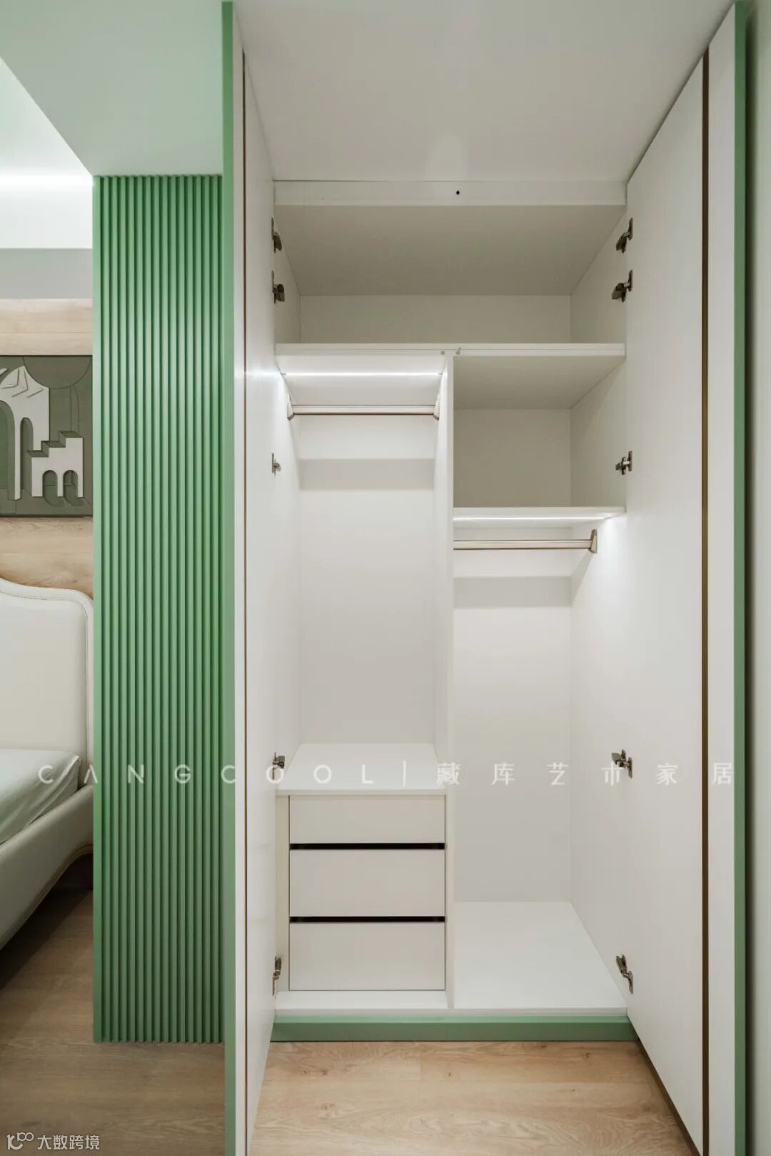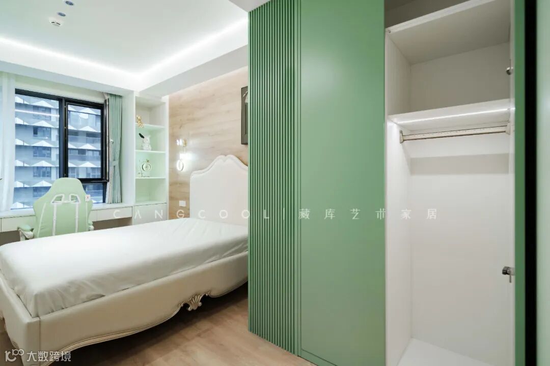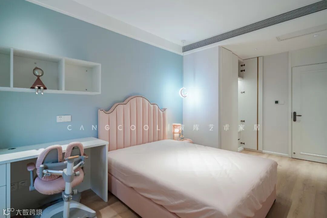 整个空间以明亮、轻松、愉悦为主的颜色进行搭配。儿童房有一个采光大窗户,我们沿窗设计了书桌,书桌上是一个可爱的兔子,充分体现童心。