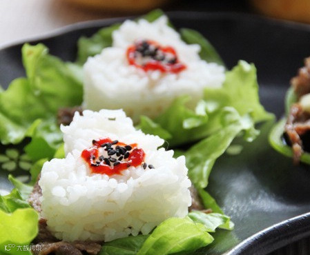 5)将生菜铺入盘中,放上一片牛肉,再将用模具压好的米饭放在上面,浇上辣酱和黑芝麻即可食用。