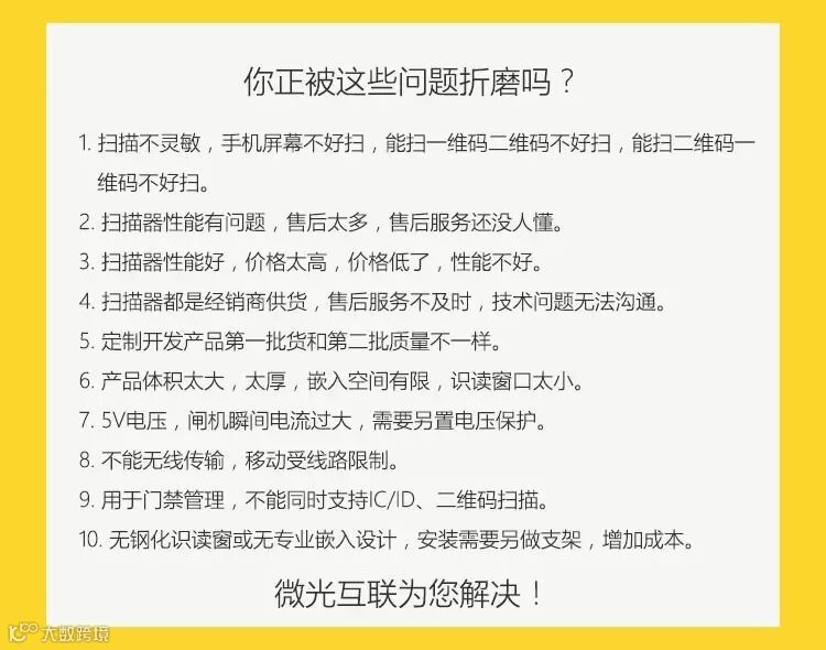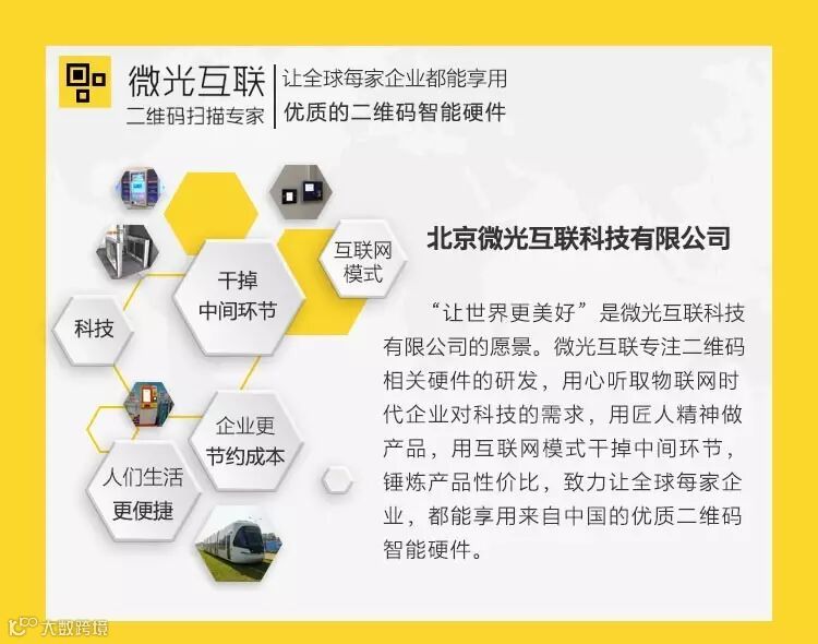 “让世界更美好”是微光互联科技有限公司的愿景。微光互联专注二维码相关硬件的研发,用心听取物联网时代企业对科技的需求,用匠人精神做产品,用互联网模式干掉中间环节,锤炼最高性价比,致力让全球每家企业,都能享用来自中国的优质二维码智能硬件。