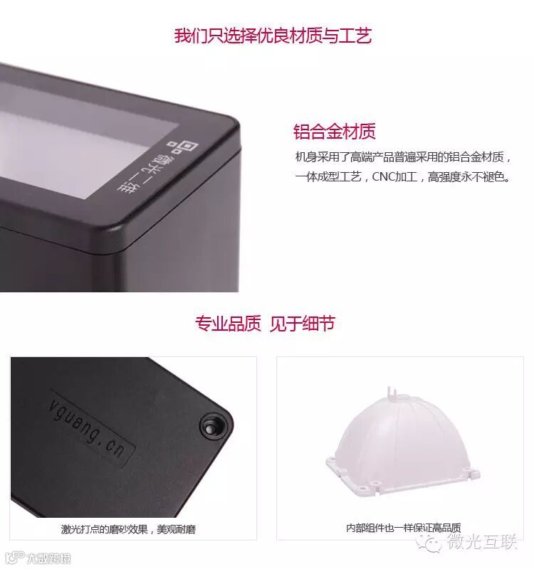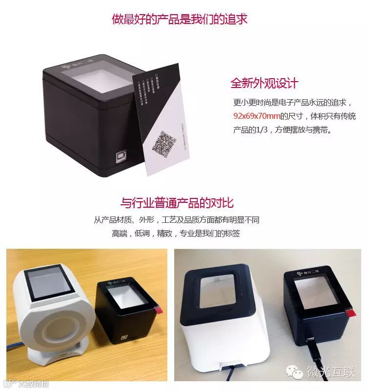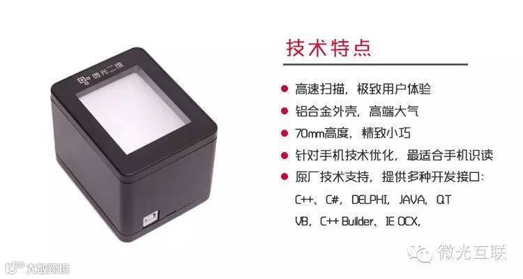 微光互联二维码扫描器是北京微光互联科技有限公司研制的新一代的二维码扫描器,设备采用铝合金整体设计,外观高端大气,扫描速度快,识别率高,同时各种硬件兼容性好,适应各种应用场景。目前广泛运用于支付宝二维码支付、微信二维码支付、支付宝二维码卡券、微信二维码卡券、大型商务会议、电子票务、终端门店管理、电子政务、企业ERP管理、办公自动化领域、银行与医院排队机等,适用于各行各业提高工作效率之应用。