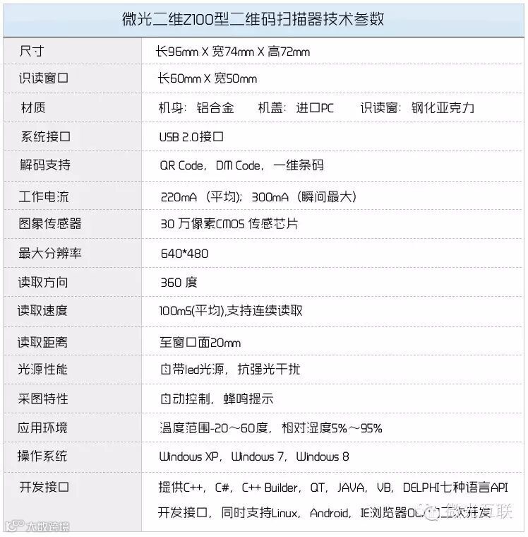 微光互联二维码扫描器有USB和RS232两种接口设备,其中USB接口以模拟键盘方式输出信息,RS232以标准串口协议输出信息。产品操作简单方便,支持手机二维码,纸质二维码,金属二维码等各种介质上的二维码,同时与支付宝二维码、微信二维码等各种主流二维码系统兼容,产品适用范围广。