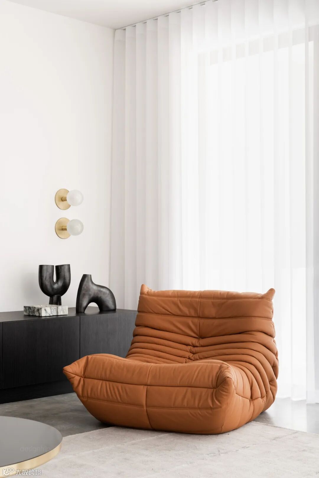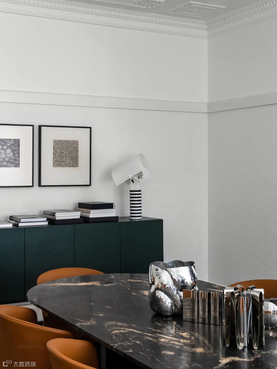 简约优雅的室内环境结合高品质的家具,创造了无与伦比的居住体验。宽敞的起居室以黑白色调为主,加以橘色调的单人沙发点缀,丰富了整体视觉。