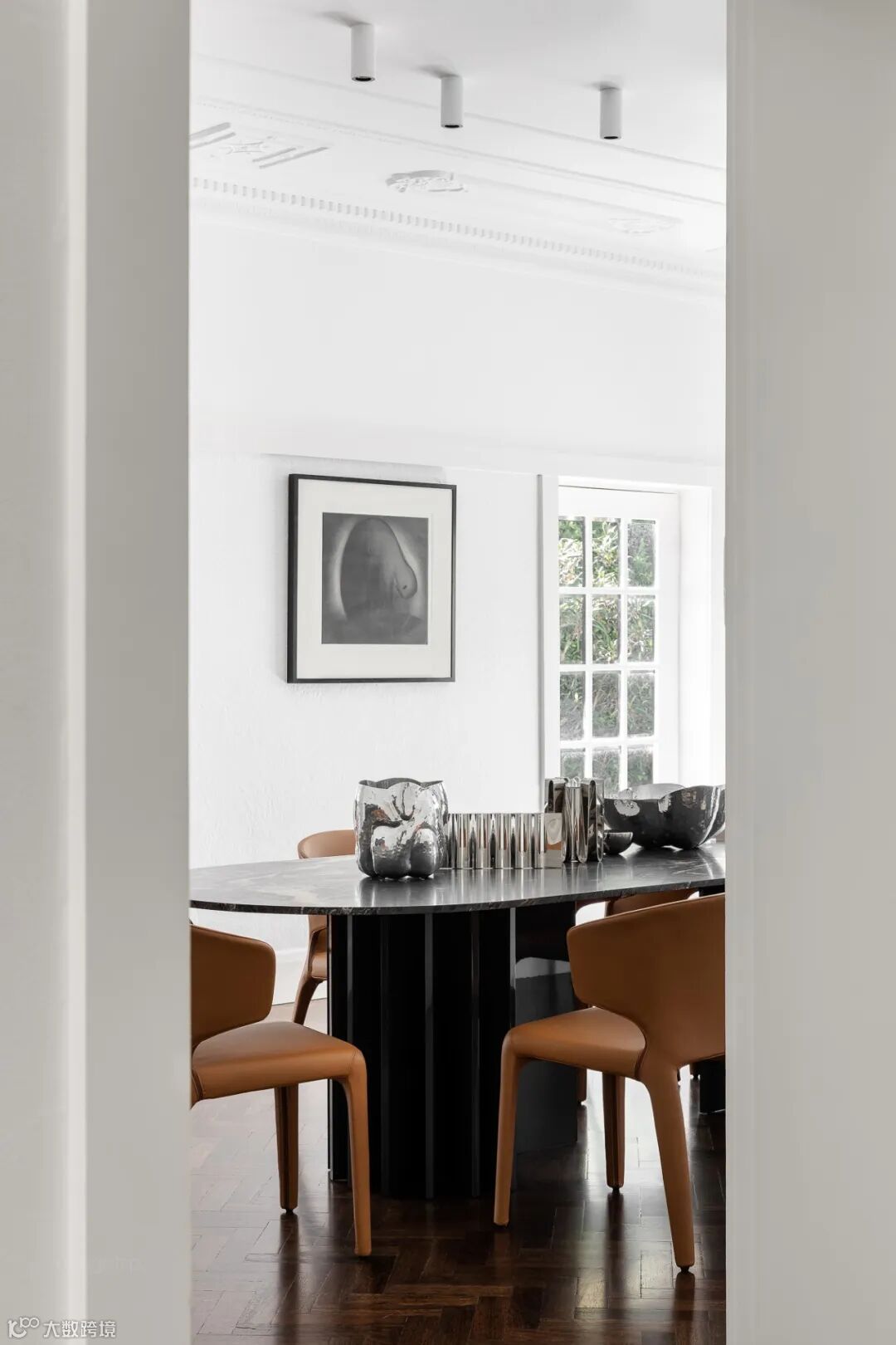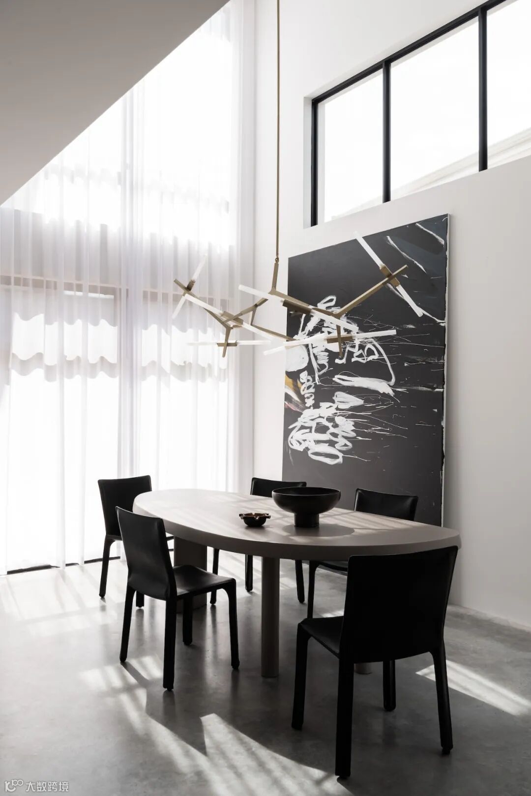 餐厅放置在通高的空间内,采光良好,枝形吊灯成为了视觉的重点,整体搭配颇有艺术气息。