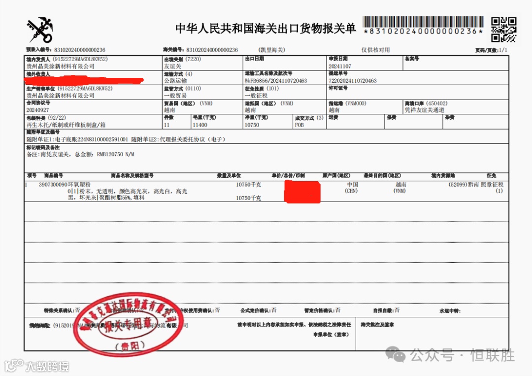 黔南州恒联胜外贸综合服务有限公司作为专业的外贸服务机构,为贵州晶美涂新材料有限公司量身定制了一整套全面且细致的外贸综合服务方案,在企业出口越南的征程中扮演了关键角色。从出口合同的起草、审核与签订,到外贸单证的制作、审核以及报关、报检等具体业务操作,恒联胜公司都安排专业团队为贵州晶美涂新材料有限公司提供一对一的指导与协助。凭借丰富的实操经验,确保每一个外贸业务环节都准确无误,让初次涉足国际市场的晶美涂公司能够迅速上手,顺利开展出口业务,避免了因业务不熟而产生的诸多问题。