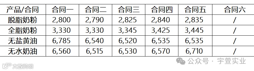 本次GDT拍卖脱脂乳粉价格上涨1.3%,均价2,788美元/公吨;全脂乳粉价格下降1.8%,均价3,388美元/公吨;黄油价格基本持平,均价6,526美元/公吨;无水奶油上涨8.6%,均价6,552美元/公吨,具体拍卖结果如下: