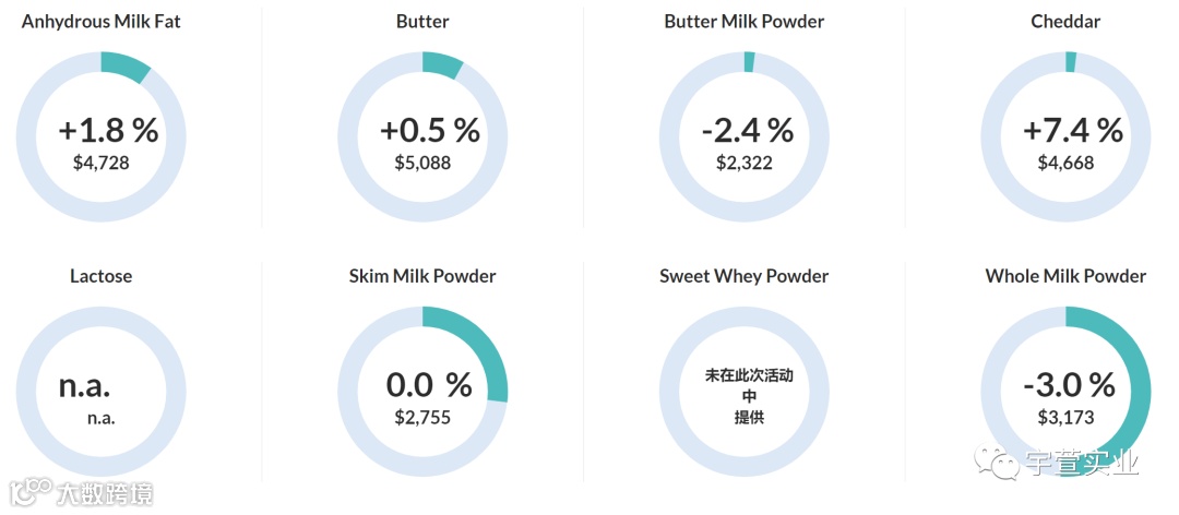 本次GDT拍卖脱脂乳粉价格持平,均价2,755美元/公吨;全脂乳粉价格下降3%,均价3,173美元/公吨;黄油上涨0.5%,均价5,088美元/公吨;无水奶油上涨1.8%,均价4,728美元/公吨,具体拍卖结果如下: