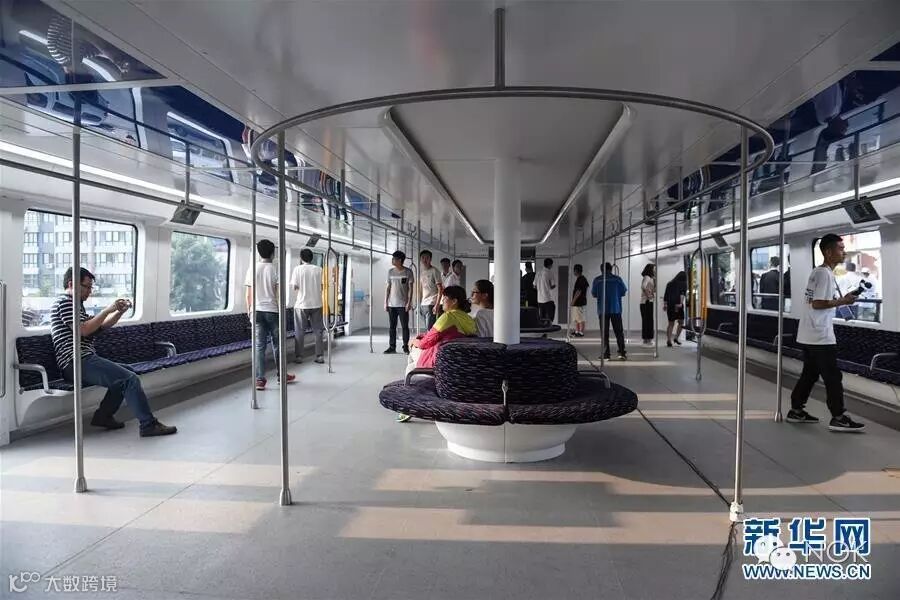 车厢内有55个座位,乘客区设有20根竖立扶手,满足高峰时段不同身高站立乘客的需求。同时,车体配备多个液晶电视屏幕,方便各个角度的乘客观看。此外,还安装了4个动态地图,便于乘客查看整个城市的交通状况。图为8月2日,体验者在巴铁1号试验车车厢内部参观。
