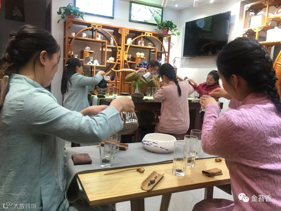 在学习绿茶的冲泡中,金苔香茶业的小伙们根据恩施玉露的历史背景以及结合叶型,用玻璃杯冲泡把玉露的优美的形态展现出来。品饮一杯早春恩施玉露,饮下的是青绿春天的滋味,回甘的是玉露茶厚重的人文底蕴。