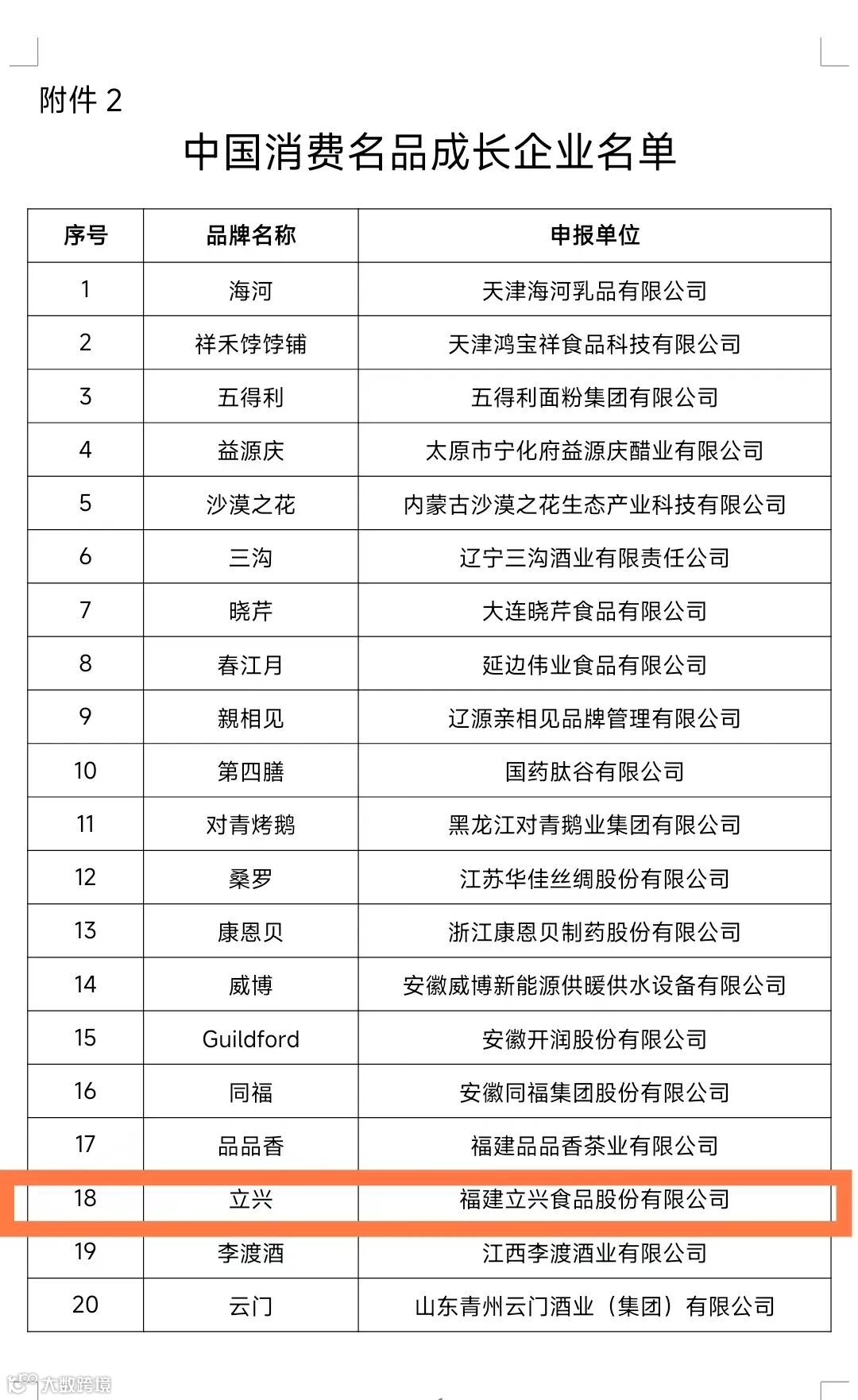 据悉,福建省6个企业品牌和2个区域品牌拟列入首批中国消费名品名单、2个企业品牌拟列入中国消费名品成长企业名单。其中福建立兴食品股份有限公司(以下简称“福建立兴”)拟入选中国消费名品成长企业名单。