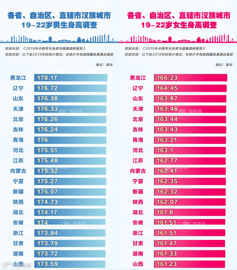 “北方最高”黑龙江与“南方最高”江苏省之间,男生身高的差值为2.69厘米;而南北方的“副班长”河南省和贵州省之间,差值则为3.52厘米;