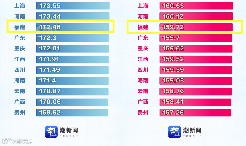 男生平均身高175.16厘米,这都比较符合大众印象;令人意外的是,