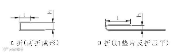 2 N折:N折成形时依据l及h尺寸值而采取不同的加工方式,一种是直接分为两折成形,另一种是加垫片反折压平,一般情况下,N折中的H为较重要尺寸.