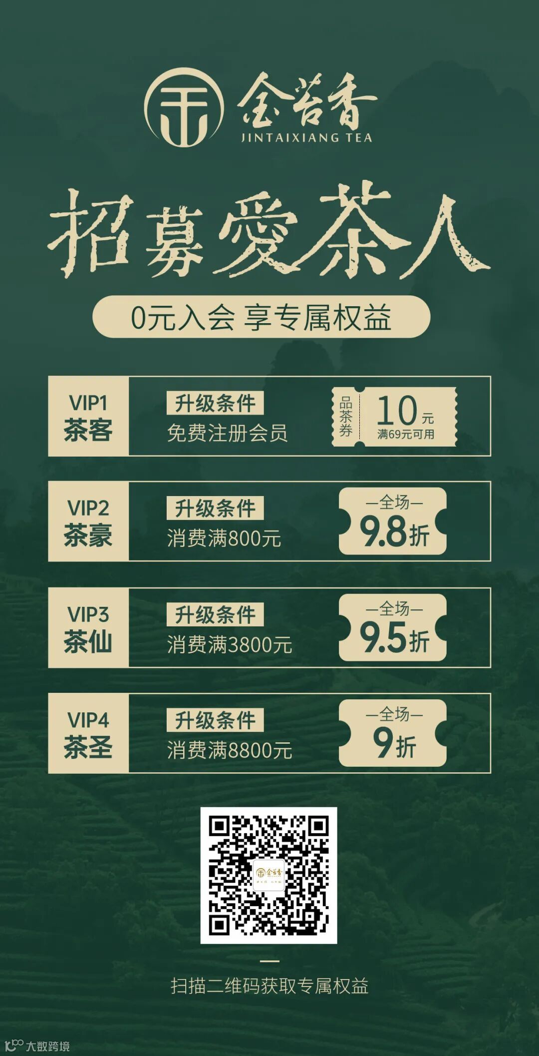 茶友们只要扫码海报中的二维码,即可免费注册会员,成为金苔香茶客,立得10元优惠券,满69元可用,买茶更显优惠。