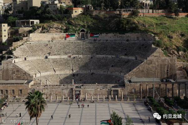 在前往博物馆的途中,拍摄的另外一个古剧场。今年是阿拉伯起义百年纪念,因此统一悬挂阿拉伯起义旗帜(左边),而右边就是约旦国旗。