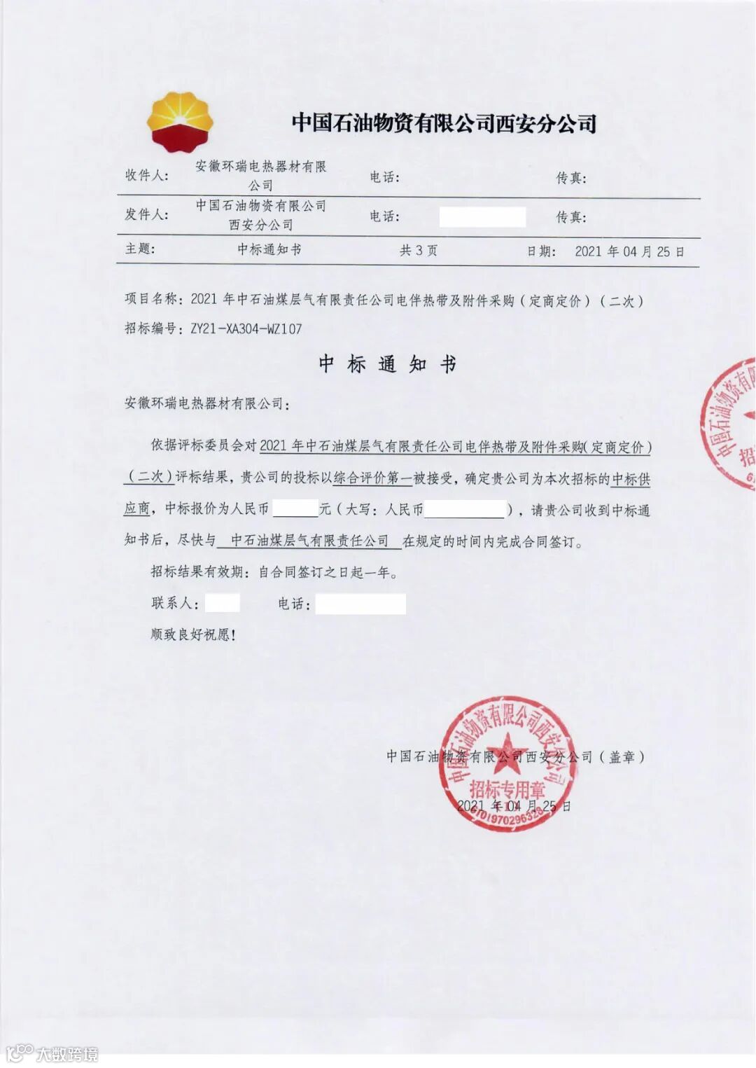 中石油煤层气公司中标通知书