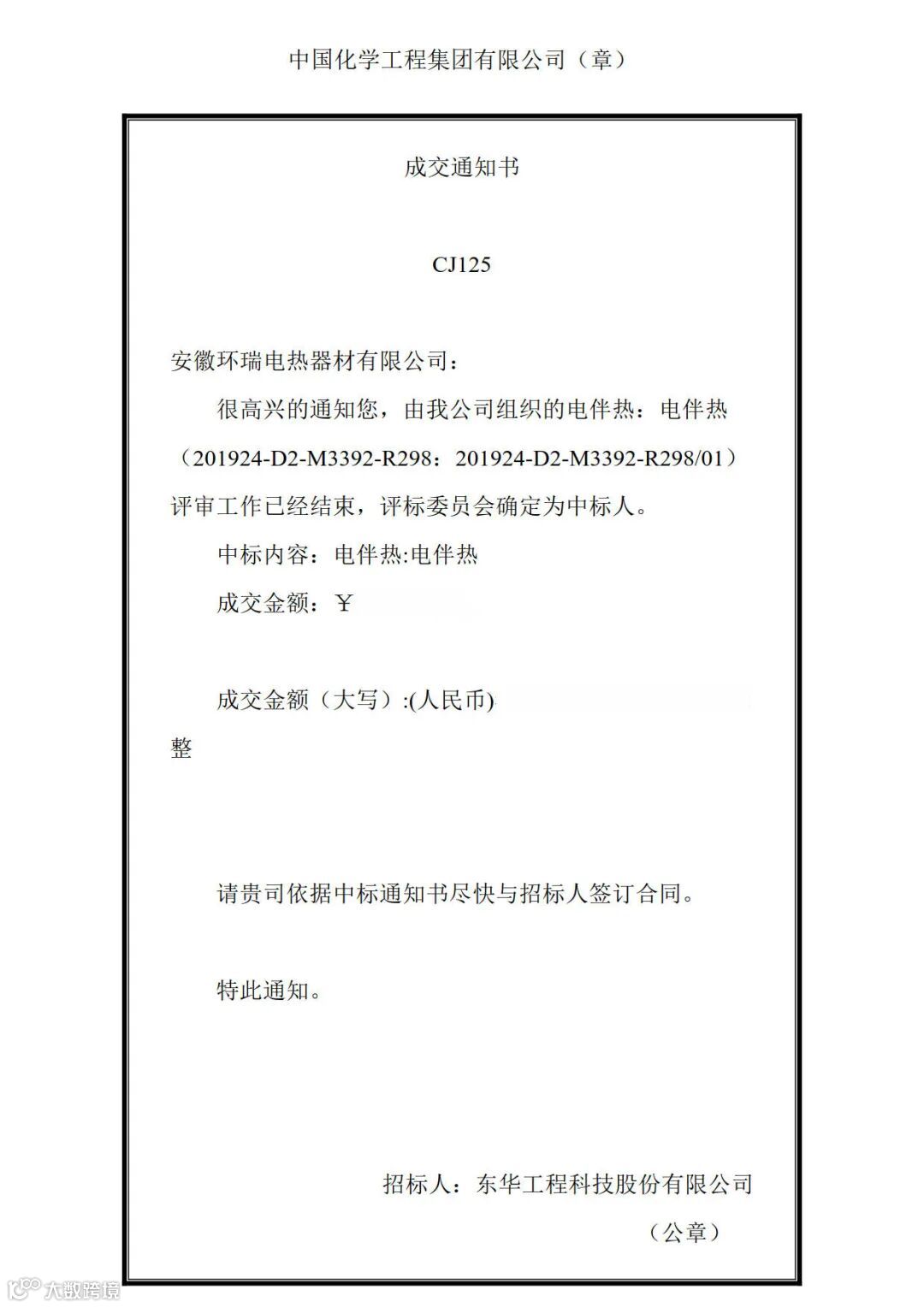 中国化学东华工程集团中标通知书