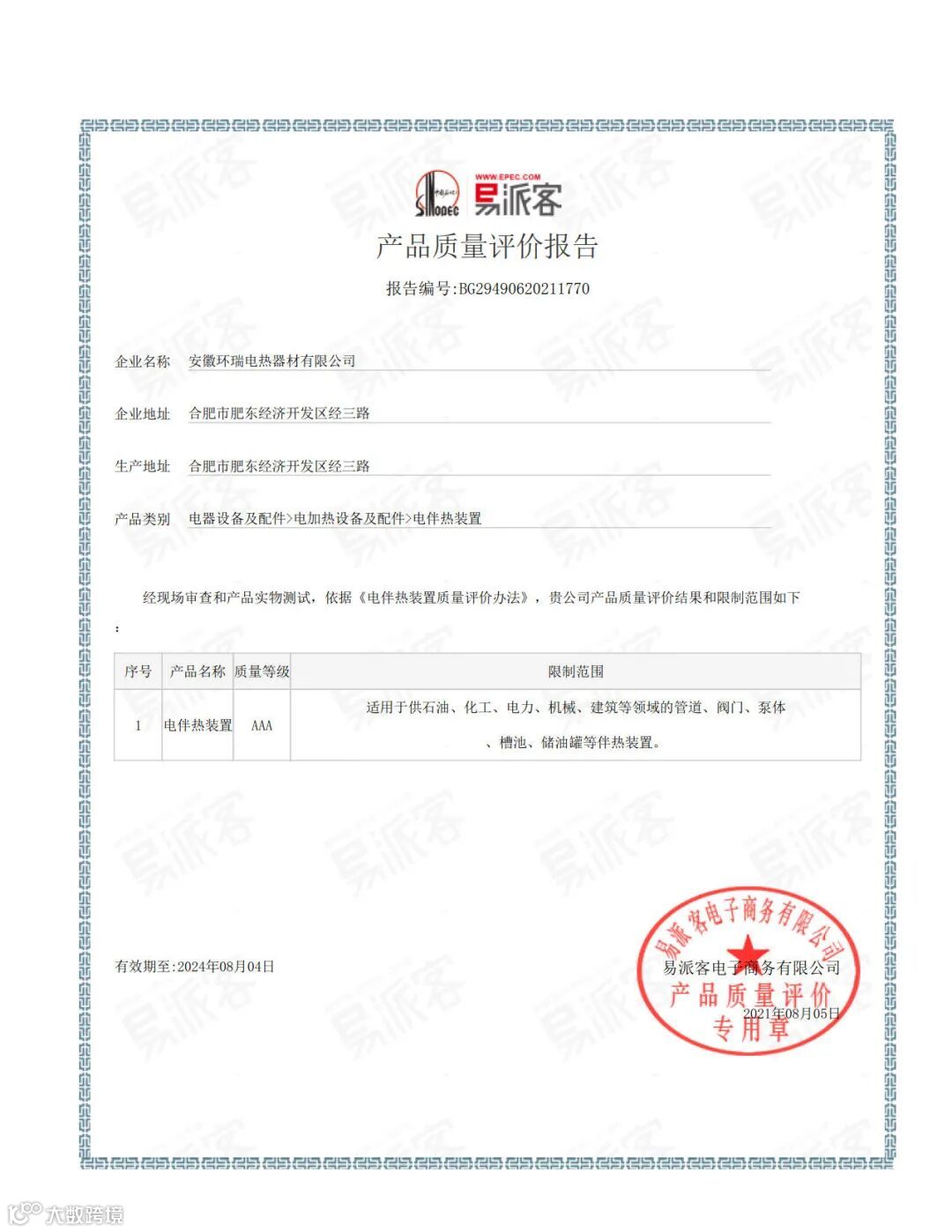 中石化易派客信用评价证书和产品质量评价报告