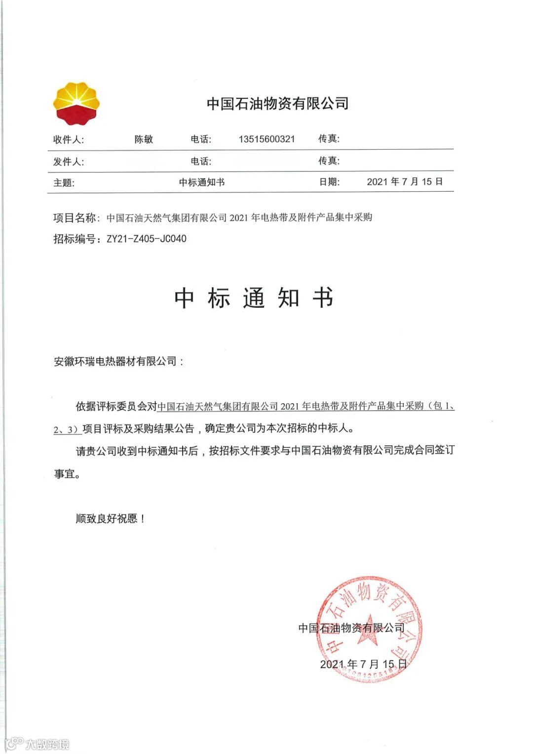 中石油天然气集团中标通知书