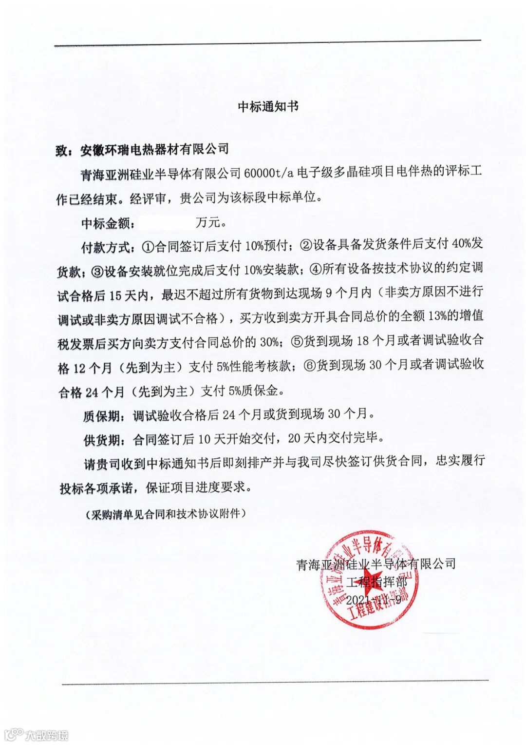 青海亚洲硅业半导体公司中标通知书