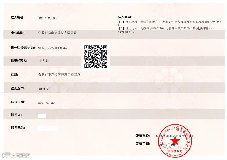 塔里木油田市场准入证