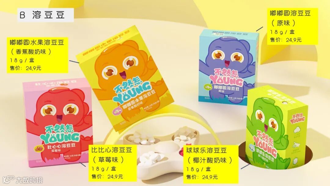 溶豆豆以优质水果+新西兰牛乳+酸奶为原料,并且额外添加益生菌;有原味、香蕉酸奶、草莓、椰汁酸奶等多种口味,除了直接食用外,还可在温奶和温开水中自然溶解,或搅拌在奶粉和米糊中作为婴儿辅食,食用场景多种多样。