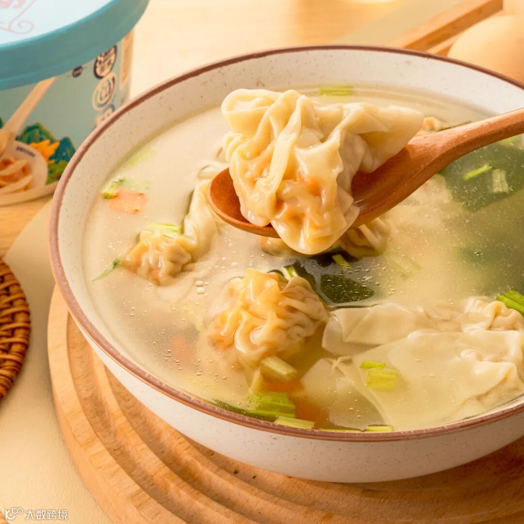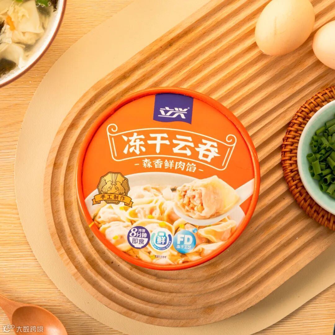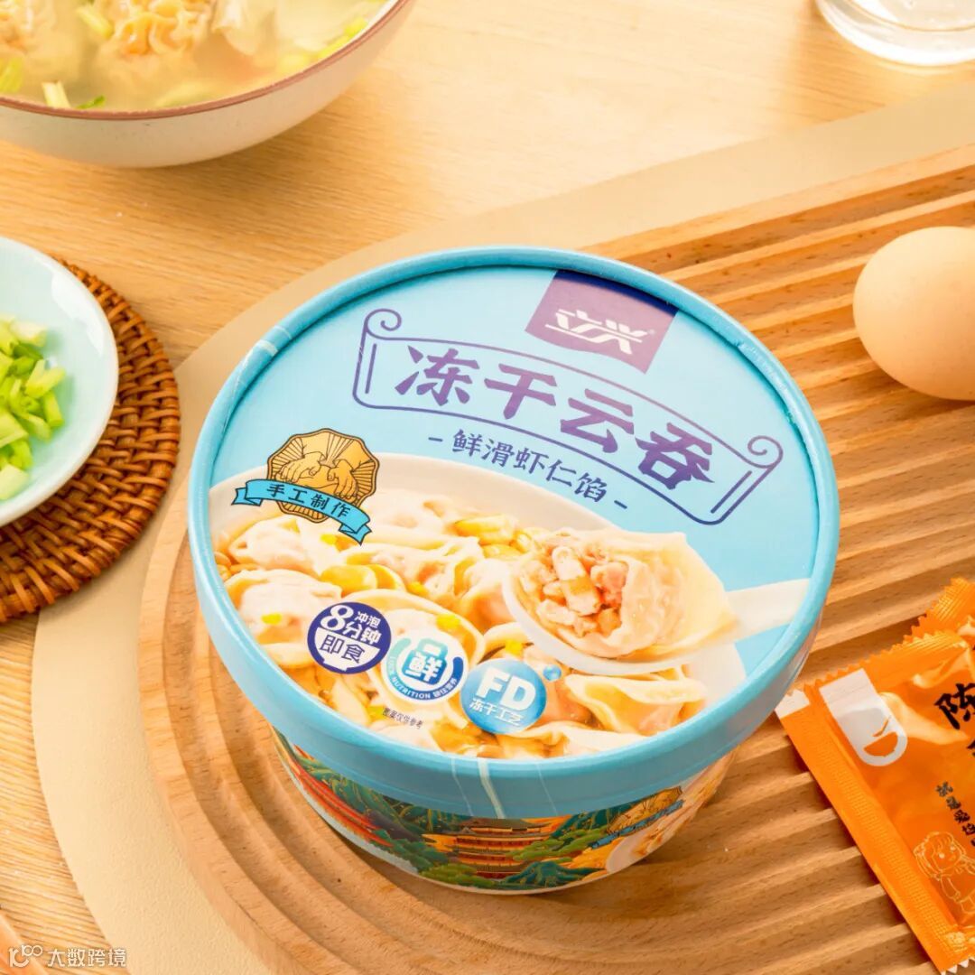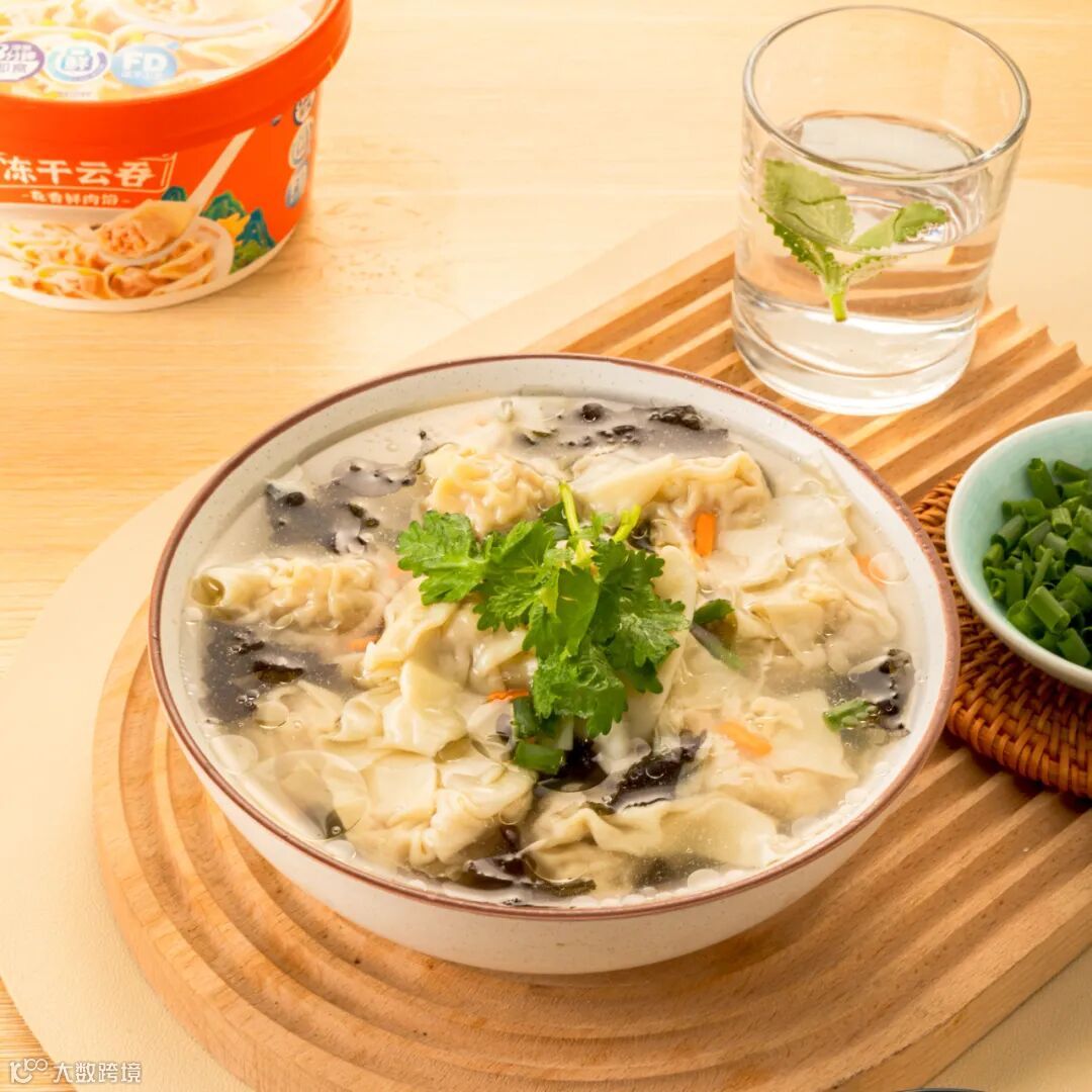 云吞,汤底全部FD冻干工艺完成。科技升级,先速冻锁鲜,后冻干升华水分,体积更轻盈,生活更轻松。