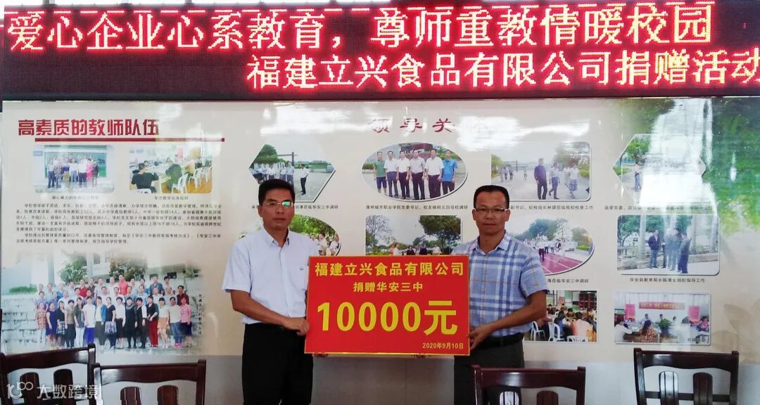 在第36个教师节来临之际,福建立兴总裁郭树松带着对教育事业的关心和人民教师的关爱,于9月10日下午走进华安三中开展爱心捐赠活动,为该校学生捐赠了饮水机与节日礼品,并为全校教职工送上节日的问候和祝福。