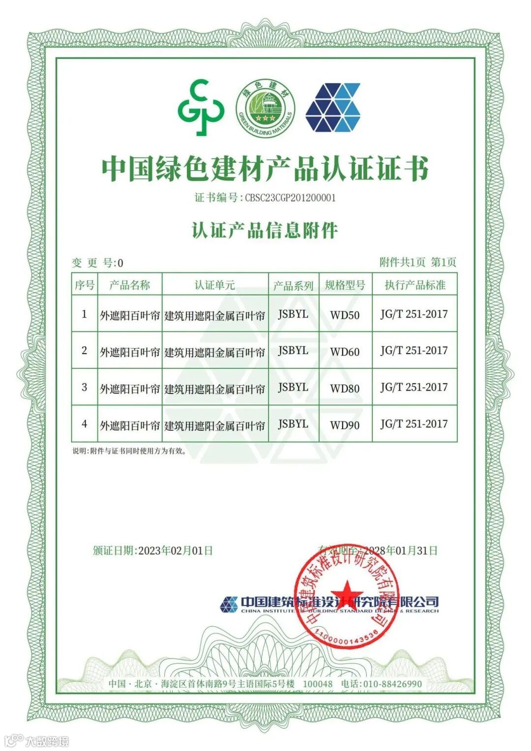 此次获得“中国绿色建材产品三星级认证”,是金星宇遮阳落实绿色发展理念、高标准高质量建设的重要成果,也是专业机构对金星宇遮阳产品品质以及公司技术能力、管理水平、综合实力等多维度的认可。