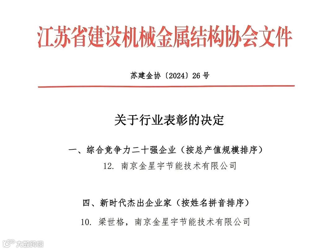 在江苏省建设机械金属结构行业表彰中,金星宇遮阳被授予“行业综合竞争力二十强企业”荣誉称号,这一奖项充分肯定了金星宇遮阳在技术研发、产品质量、市场拓展以及企业管理等方面的综合实力;金星宇遮阳董事长梁世格被授予“新时代杰出企业家”荣誉称号,这一殊荣不仅是对梁世格先生个人领导能力与行业洞察力的高度认可,也反映了金星宇遮阳在企业文化建设、人才培养以及社会责任履行等方面的全面发展。